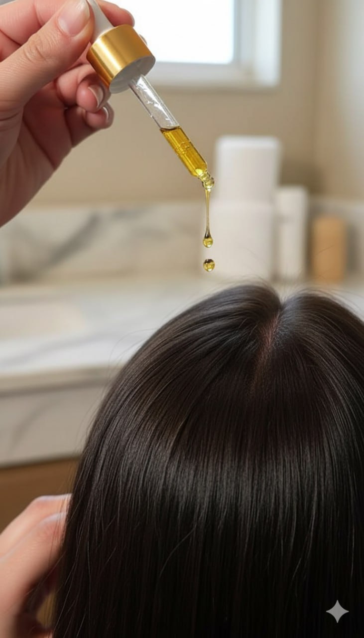 Aplica el aceite en el cuero cabelludo y masajea con las yemas de los dedos con movimientos circulares.